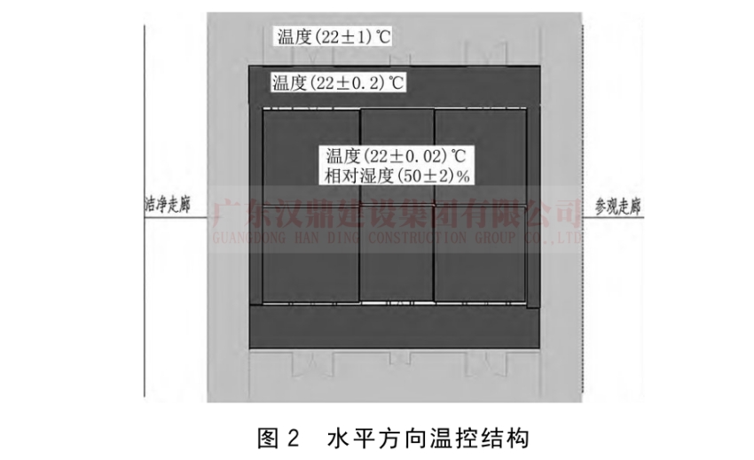 精密温控区温度控制精度为士0.02℃。设计时在水平和竖直方向上设置了3层温控结构,在精密温控区域周边(竖直及水平方向上)设有士0.2℃和士1.0℃两级缓冲区域,从围护结构上,隔断了周边环境温度波动对该区域的影响,有利于精密温控系统的稳定。需要说明的是,在竖直方向上,在工艺核心区(士0.02℃区域)上空做双层吊顶以形成静压箱,静压箱内温度精度控制到士0.2℃,静压箱外与建筑屋面形成的腔体温度精度控制到士1℃,如图1所示。在水平方向上,外走廊温度控制精度为士1℃,内走廊温度控制精度为士0.2℃,核心区温度控制精度为士0.02℃,相邻核心区采用2个夹道腔体物理隔离,不采取主动温度控制措施,如图2所示。