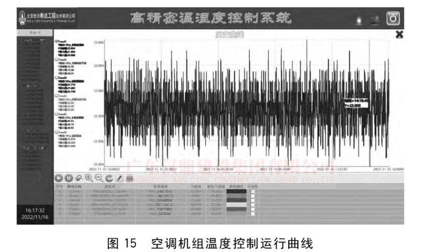 根据多年温度精度控制项目经验,温度精度能否控制稳定,最主要因素取决于冷水供水温度是否稳定。在以往案例中,设置闭式水系统缓冲罐,增加系统水容量是常用的控制供水温度稳定的必要手段。因该项目最高温度精度控制需要士0.02℃,故在设置缓冲罐的被动措施基础上,在缓冲罐前,又加设了主动控制措施,如图3所示。需要说明的是,通过调整缓冲罐前三通阀开度,分配进入缓冲罐的供水流量,可以控制缓冲罐供水温度精度在士0.1℃,缓冲罐后设置中温冷水管道泵,管道泵至空调机组盘管前设置三通冷水阀组,以控制空调器冷水盘管后温度,管道泵定频运行。