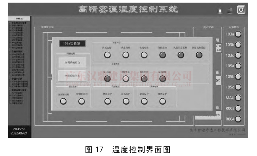 1)上述每个系统,都配备相对独立的自控系统。核心控制区实验室每个系统设置1套含HMI的自控柜。其中直接服务于实验室的6套空调系统分成2个单体控制柜:①实验室附近的控制柜挂墙安装,含HMI,末端的风道电加热及分布式末端电加热在此直接控制,终极控制精度温度为士0.02℃,相对湿度为士2%。