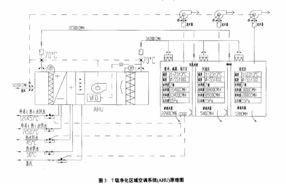 在本工程中,厂房中工艺设备散热量较大,而湿负荷主要来自人员散湿。因此,在本工程设计中,对于洁净等级为5级、6级的净化区域,采用了上述新风处理机组(MAU)+风机过滤单元(FFU)+干盘管(DCC)的空调形式,新风处理机组设置在1层左侧动力站房内,干盘管(DCC)设置在回风夹道进入静压箱层的风口处,并且在动力站房内设置一套板式换热器,将所区动力站供给的7℃/12℃低温冷水转换为14℃/19℃的中温冷水供干盘管(DCC)使用。FFU断面风速0.35m/s,5级正压控制在25pa,6级正压控制在20pa。