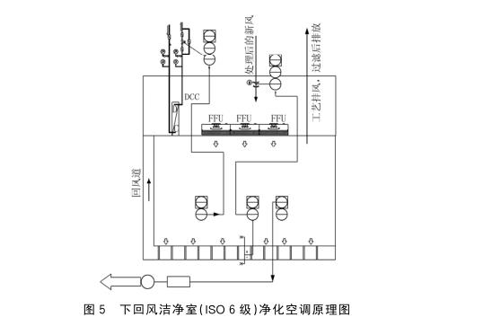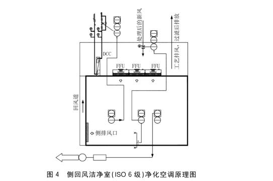 该项目气流组织设计为:检测区ISO 4级和ISO 5级的洁净区设高架地板(0.8m), 采用上送下回方式,即FFU送风进入房间后通过架空地板经回风夹道至吊顶上,同时经回风夹道上方干盘管降温后在上技术夹层与新风混合;包装区ISO 5,6 ,7级的洁净区 均采用上送侧下回方式,即FFU上送风,回风穿过两侧下方的回风口进入回风夹道,经回风夹道上方干盘管降温后在上技术夹层与新风混合。气流组织原理如图4和图5所示。