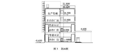 为节省占地和节省设备管道,空气净化机房、超纯水处理站贴建在一层,洁净空气、纯净水通过技术管道夹层送到洁净生产区。