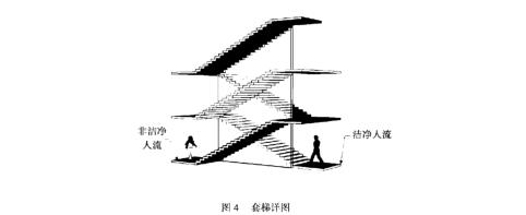 对于整个厂房,还有非洁净人、物流、消防疏散问题都必须统筹解决好。一个简单的办法就是洁净与非洁净部分分别设置出入口,但在有限的建筑空间内设置4个出入口,显然很不经济,也不利于管理及两区之间必要的联系。详细分析该厂房人、物流的流程及各部分的关系,建筑平面采用一字形布置,中间为生产区 ,两端各设置一个门厅,东侧门厅为人流出入口,西侧门厅主要为货流出入口,同时兼顾人员的紧急疏散口,每个门厅内设置一部套梯,通过套梯将洁净与非洁净人、物流分开 ( 图 4)。