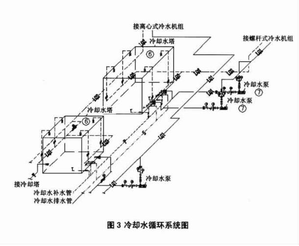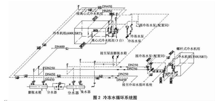空调水系统(见图 2﹑图 3)为一次泵变水量系统﹐管路采用双管制﹐通过冷冻机房分(集)水器上的阀门切换来实现冬夏冷负荷调节。系统膨胀水箱设置于四层屋面。供﹑回水总干管位于顶层﹐分八路供﹑回水立管给 1 层 ~4 层空调系统供水(其中四层为预留)﹐通过回水立管的平衡阀调节各个立管内的水流量﹐供﹑回水总管及立管为异程序﹐水平支管为同程序。