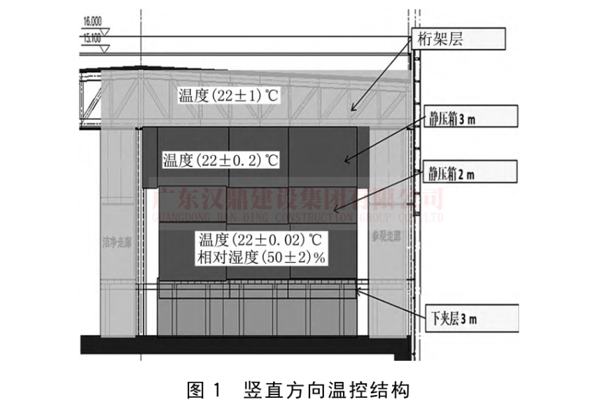 精密温控区温度控制精度为士0.02℃。设计时在水平和竖直方向上设置了3层温控结构,在精密温控区域周边(竖直及水平方向上)设有士0.2℃和士1.0℃两级缓冲区域,从围护结构上,隔断了周边环境温度波动对该区域的影响,有利于精密温控系统的稳定。需要说明的是,在竖直方向上,在工艺核心区(士0.02℃区域)上空做双层吊顶以形成静压箱,静压箱内温度精度控制到士0.2℃,静压箱外与建筑屋面形成的腔体温度精度控制到士1℃,如图1所示。在水平方向上,外走廊温度控制精度为士1℃,内走廊温度控制精度为士0.2℃,核心区温度控制精度为士0.02℃,相邻核心区采用2个夹道腔体物理隔离,不采取主动温度控制措施,如图2所示。