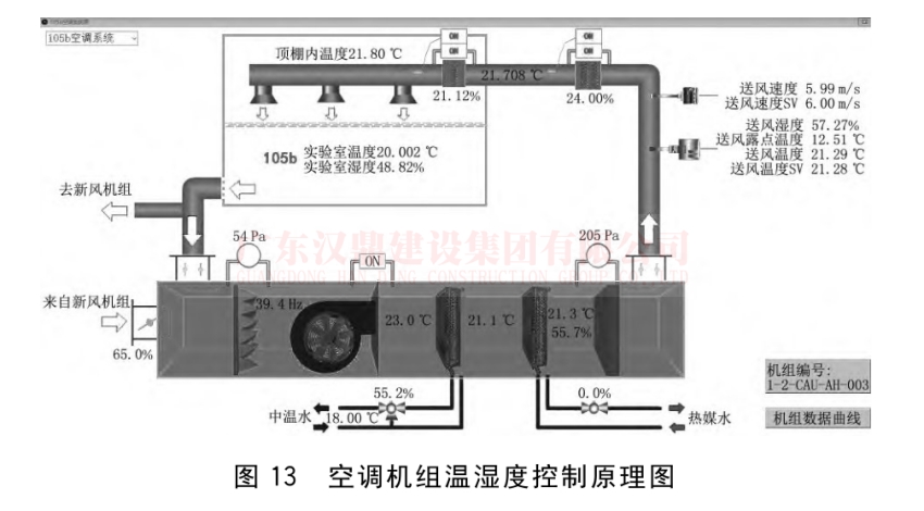 5) 新风机组湿度控制原理。在新风机组出风口设置送风露点传感器,根据露点温度双向控制表冷段与加湿段的工作,加湿除湿自动过渡,以实现送风露点温度的稳定。露点温度的目标设定值,根据各房间湿度偏差值经综合运算后反馈给定。新风机组通过送回风压差自动调节风机频率,自动稳定各实验室不同的新风量。空调机组(AHU)单台可接收新风量10%以上,换言之,房间内温度不变的情况下,相对湿度每调节1%,理论上需要6min,为避免对实验室温湿度造成波动,算法会自动调节,从而有所延缓。